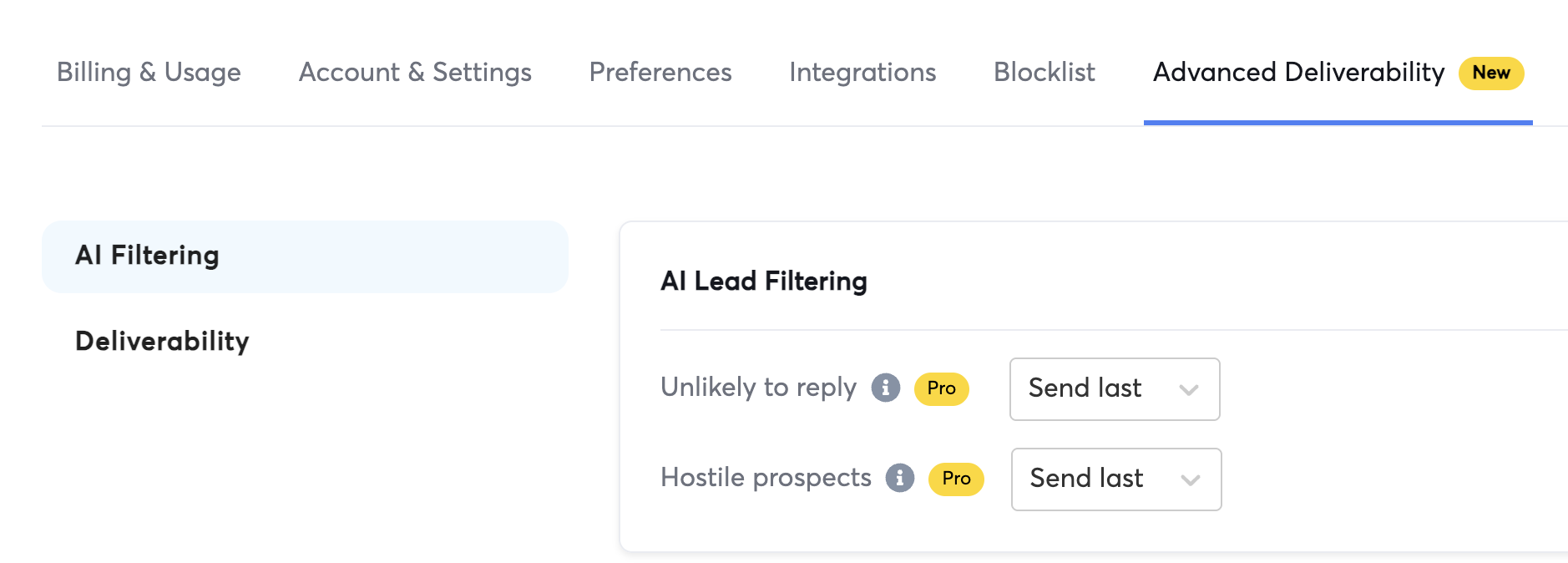 These features help protect your sender reputation by avoiding leads that are either unlikely to respond or likely to respond negatively & report your email.